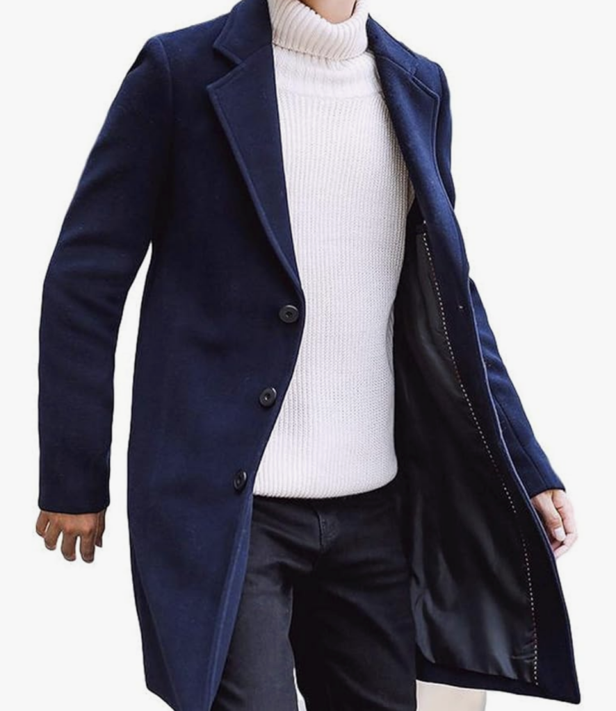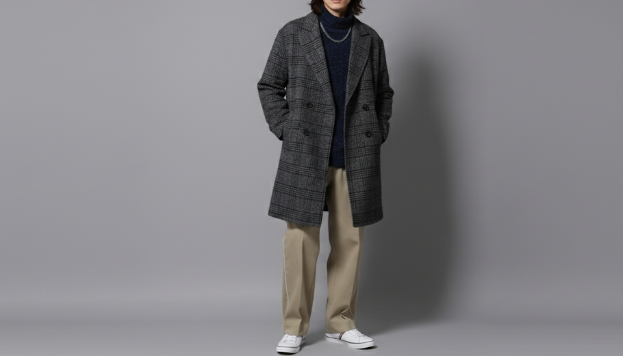 グレーのチェスターコート × ネイビーのタートルネックニット × ベージュのスラックス × 白スニーカー