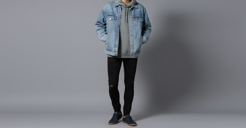 アッシュブルーのデニムジャケット × グレーのパーカー × ブラックスキニー × ネイビーのスニーカー