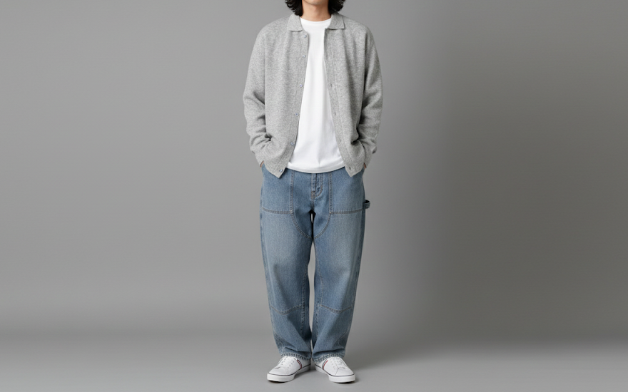 ライトグレーのカーディガン × 白Tシャツ × アッシュブルーのデニム × ホワイトスニーカー