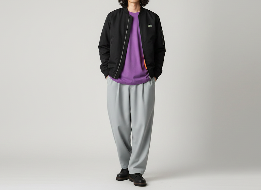 ブラックのMA-1 × パープルのロンT × グレーのワイドパンツ × ブラックブーツ