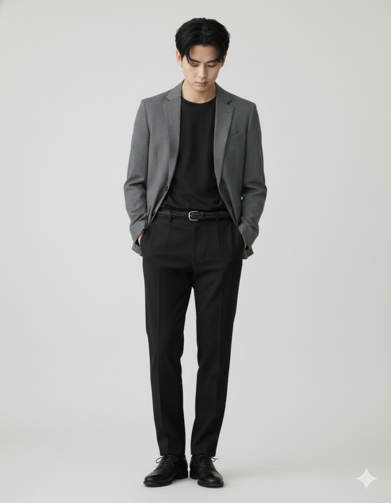 - ボトムス:ダークグレーのスラックス