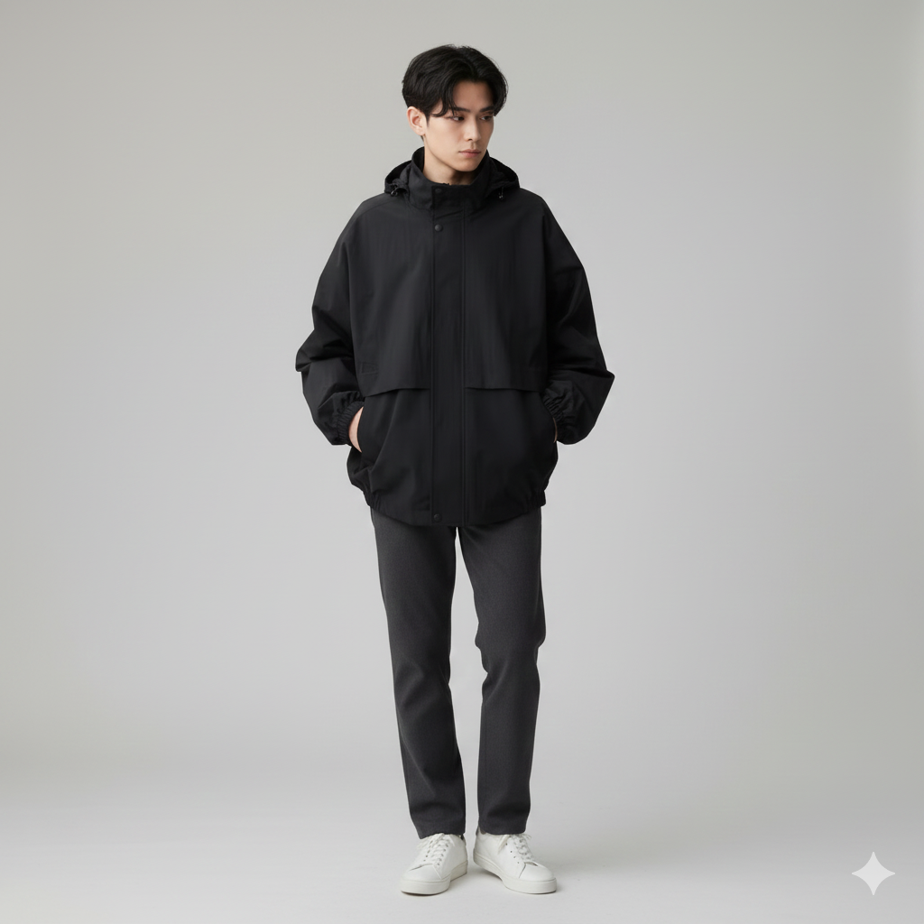 アイテム1:ウィンドプルーフセーリングジャケット(ブラック)— トレンドの「こなれ感」を演出