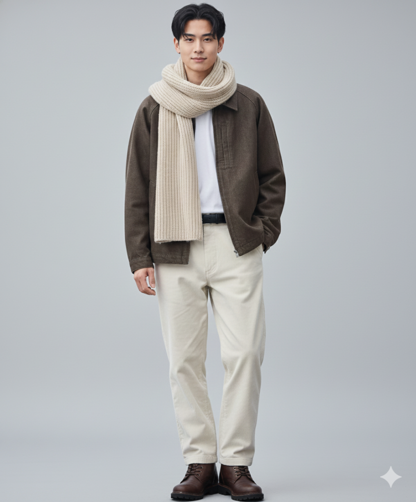 - マフラー:ベージュのニットマフラーを大きく巻いて