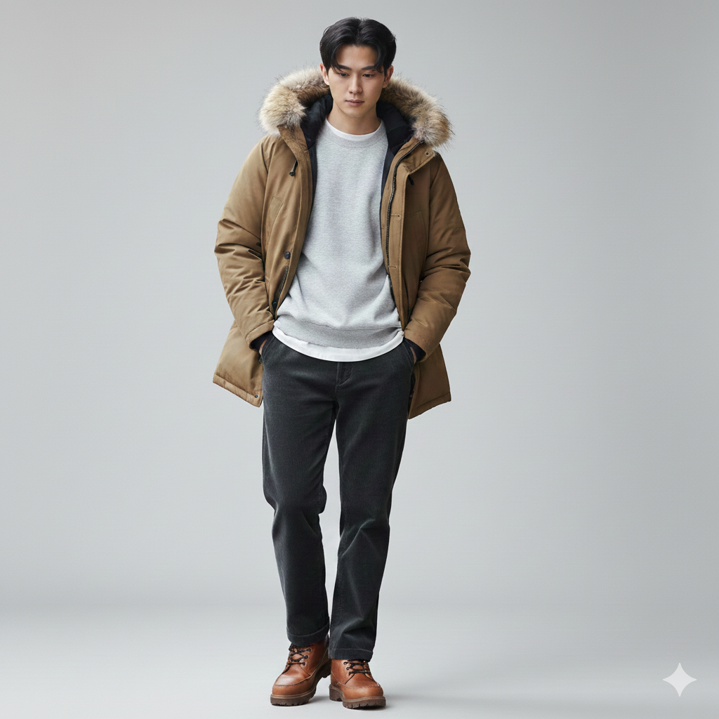 スウェットというカジュアルアイテムを、ダウンジャケットとスラックスで大人っぽく格上げしたコーディネート。ファー付きのダウンが高級感を演出し、スウェットのラフさとのギャップが絶妙です。