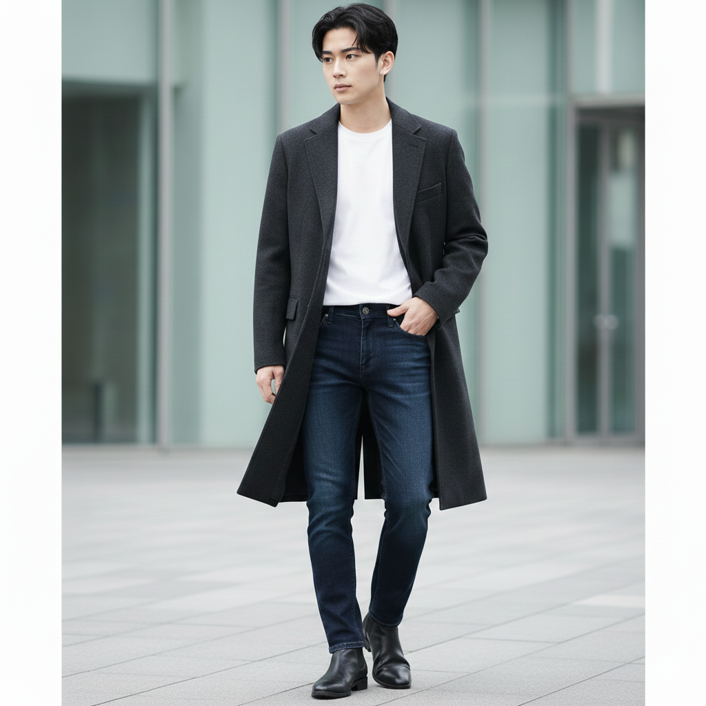 黒or紺のチェスターコートは、デニム+白Tシャツのシンプルコーデでも一気に大人っぽくなります。就活の私服面接にも対応可能です。
