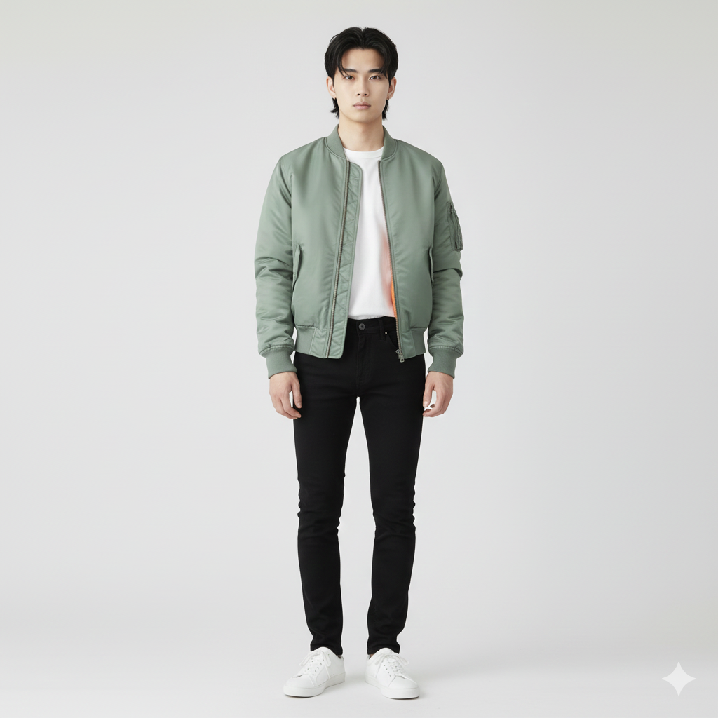 MA-1は「細身パンツ×スニーカー」の王道スタイルで。カーキやセージグリーンなら春らしさも演出できます。