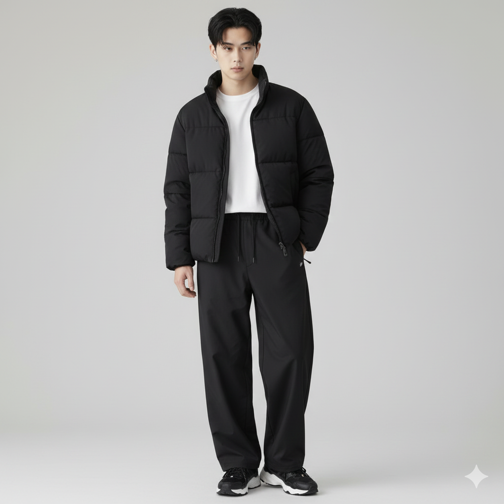 黒のパデッドジャケット+スラックス+スニーカーで、スポーツMIXスタイルに。ワイドシルエットが今っぽいです。