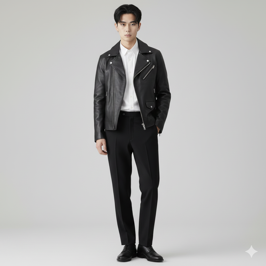 黒のレザージャケットは、白シャツ+黒パンツで”ミニマルモード”に。春先はTシャツの上に羽織るだけでも決まります。