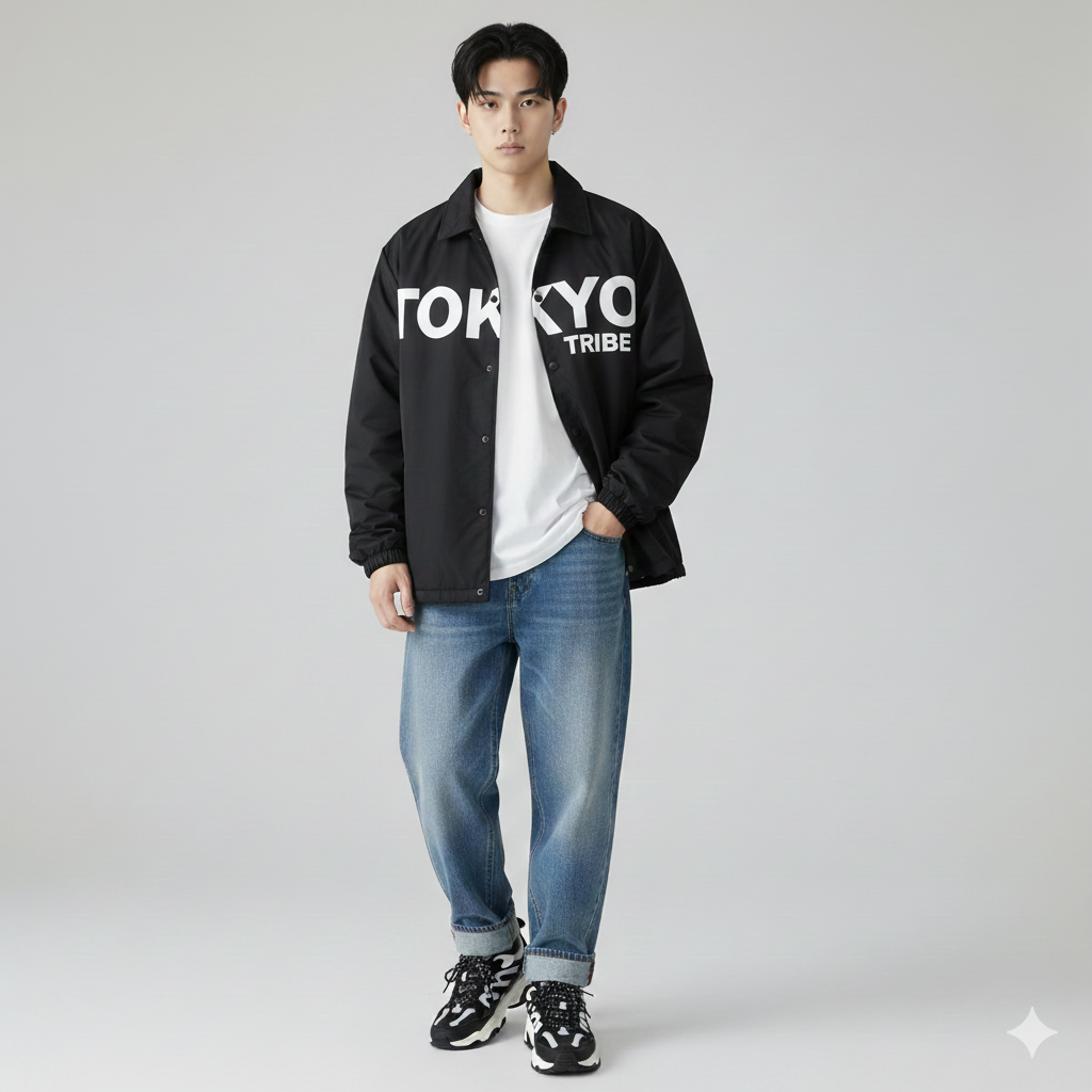 ロゴ入りコーチジャケット+デニム+ハイテクスニーカーで、ストリートカジュアルに。