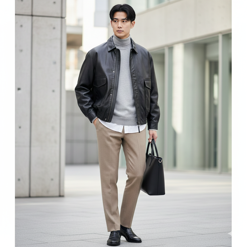 あえてデニムではなく、レザージャケットをキレイめに寄せる着こなし。