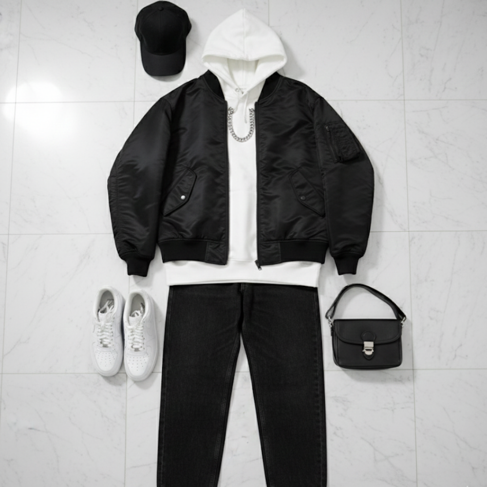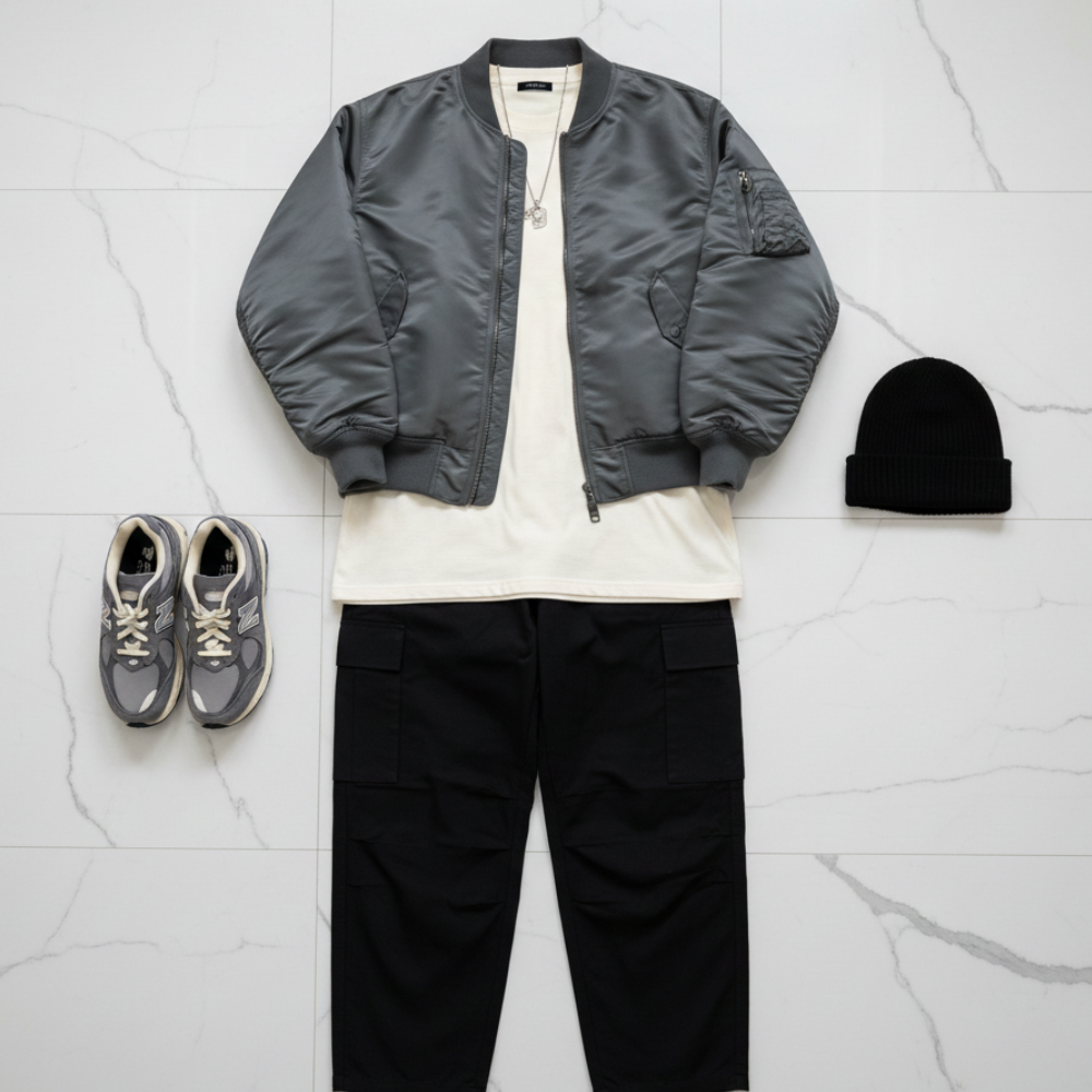 ワイドパンツと合わせてゆるっとしたシルエットを楽しむもよし、スキニーで細身に着こなすもよし。ストリートにもきれいめにも振れる懐の深さが、このMA-1の最大の魅力です。