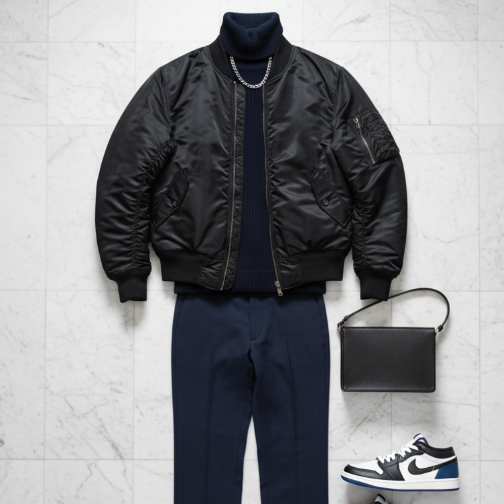 MA-1にスラックスを合わせることで大人っぽいストリートスタイルに。タートルネックで首元にボリュームを持たせると顔周りがスッキリ見える。