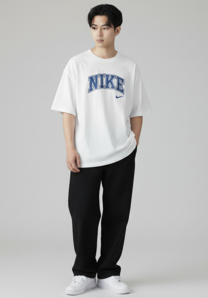 90s ナイキTシャツ(XL) + 黒のワイドパンツ + エアフォース1