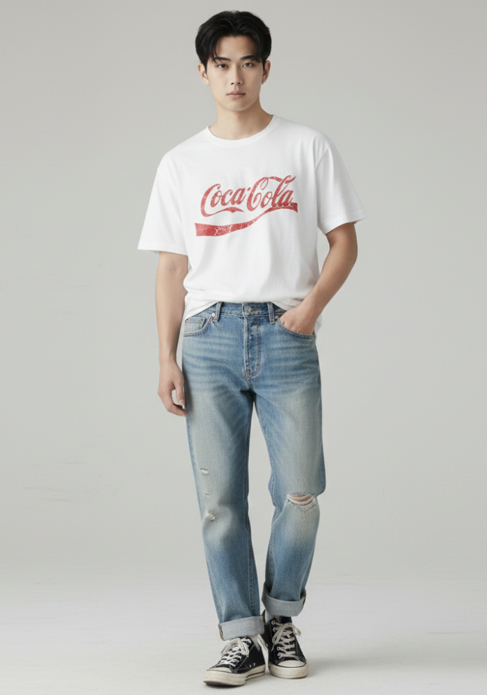 コカコーラのTシャツ(白) + デニム + 黒のスニーカー