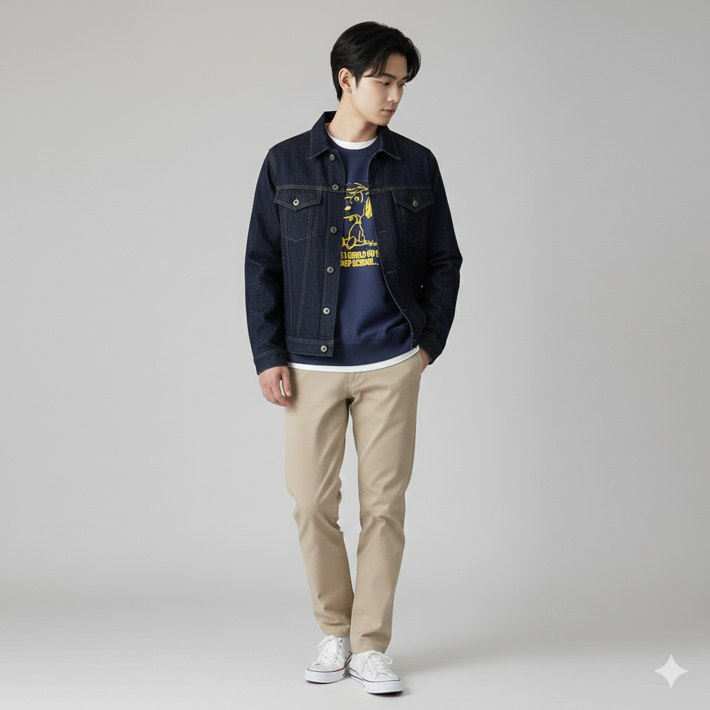 • ポイント: アメカジ定番のアイテムをネイビーとベージュでまとめることで、大人のリラックス感あるカジュアルスタイルに。スヌーピーのプリントが親しみやすさをプラスします。