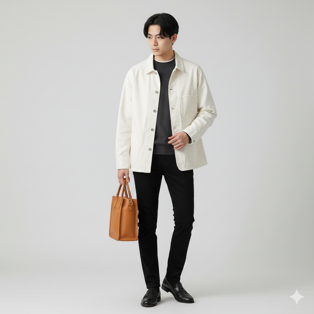 • ポイント: クリーンな白アウターを軸に、インナーとボトムスをダークトーンで統一することで、メリハリのある都会的なカジュアルスタイルが完成します。