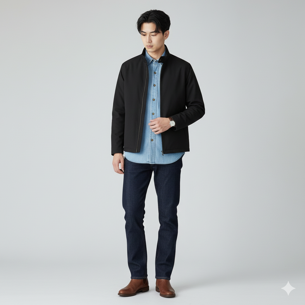 • ポイント: ライトなデニムシャツと濃い色のデニムパンツでグラデーションを作り、アウターに黒を合わせることで引き締まった印象に。
