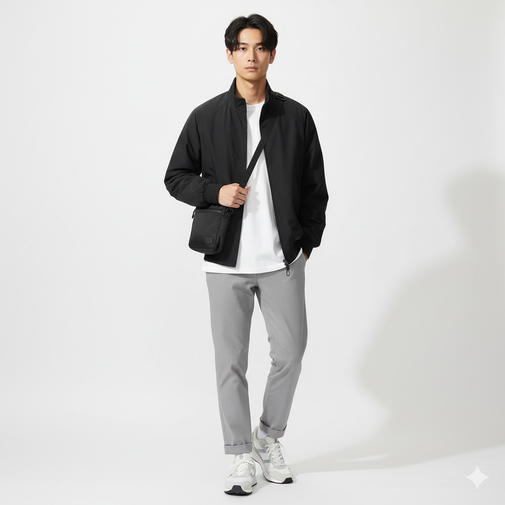 • ポイント: ミニマルなブルゾンとスラックスの組み合わせに、スポーティーな小物を合わせて軽快でモダンな印象に。