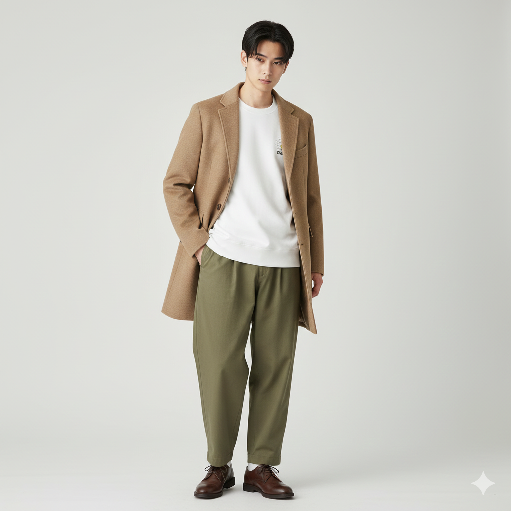 • ポイント: 白スウェットとオリーブパンツでリラックス感を演出しつつ、ロングコートときれいめな革靴で大人っぽさをキープします。