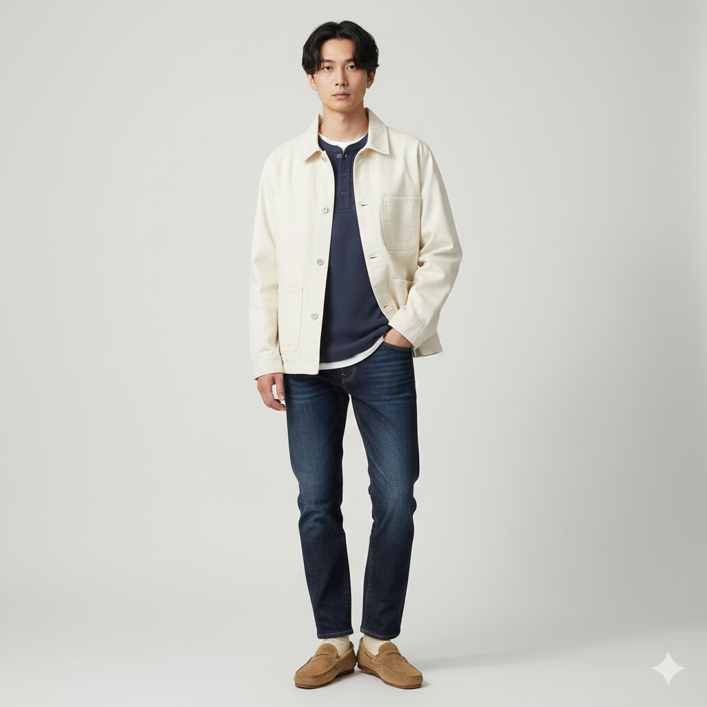 • ポイント: 凹凸感のあるワッフル生地をインナーにすることで、アウター(特に無地のアウター)の着こなしに深みが生まれます。ネイビーとオフホワイトのコントラストも爽やかです。