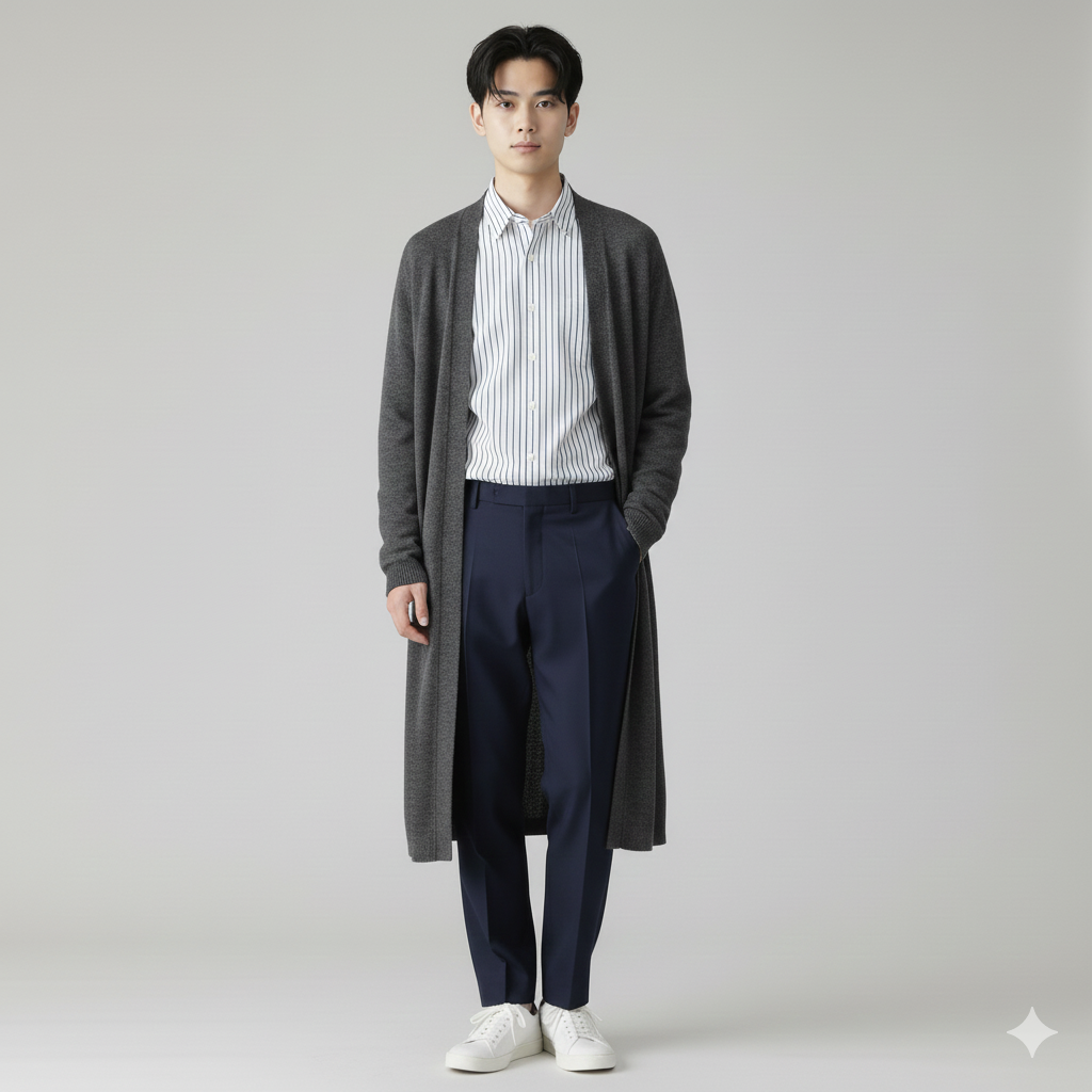 身長を高く見せる最も効果的な方法は、縦のラインを強調することです。ロングカーディガンやシャツワンピースをサラッと羽織ると、縦長のIラインシルエットが完成し、全体がスッキリとした印象になります。