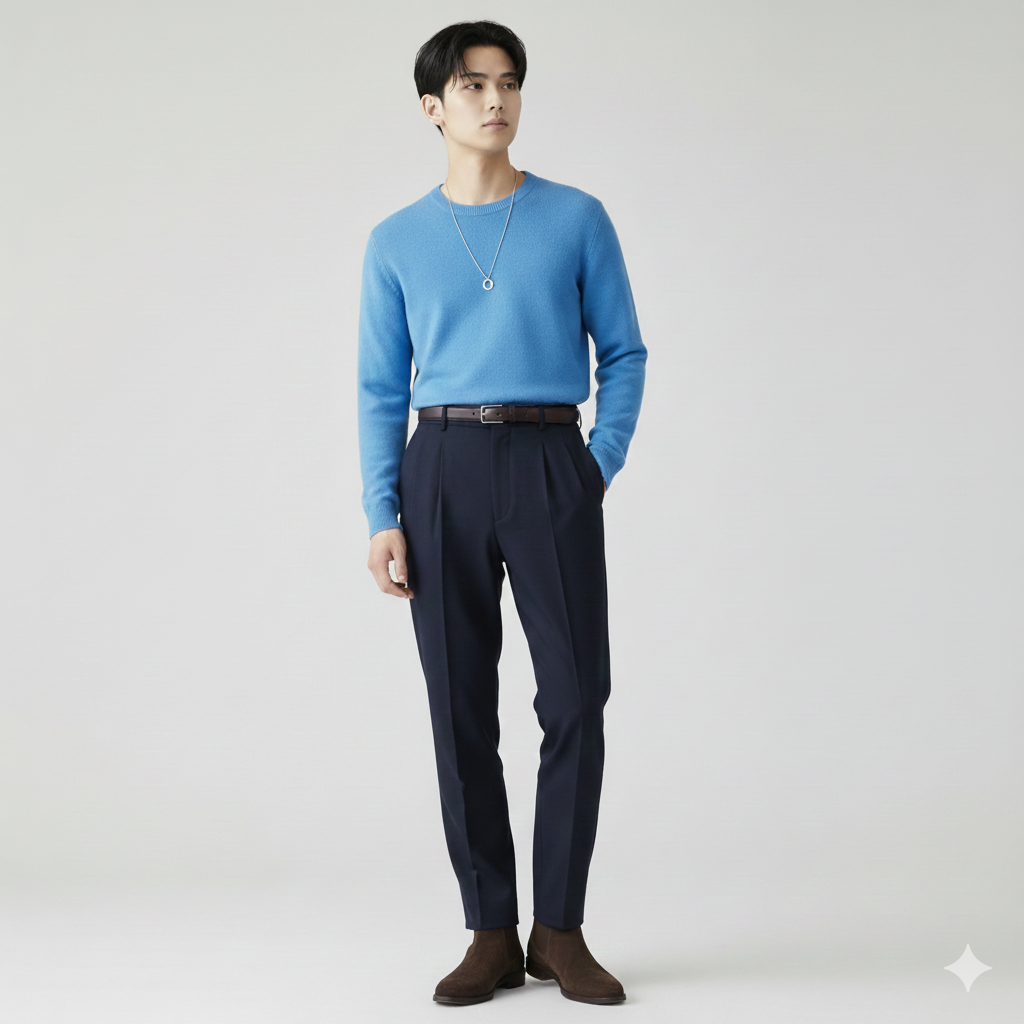 ファッションにおいて「目線をどこに誘導するか」はとても重要です。ハイウエストのボトムスを選んだり、トップスをボトムスにインすることで、ウエストの位置が高く見え、自然と脚が長く見える効果があります。
