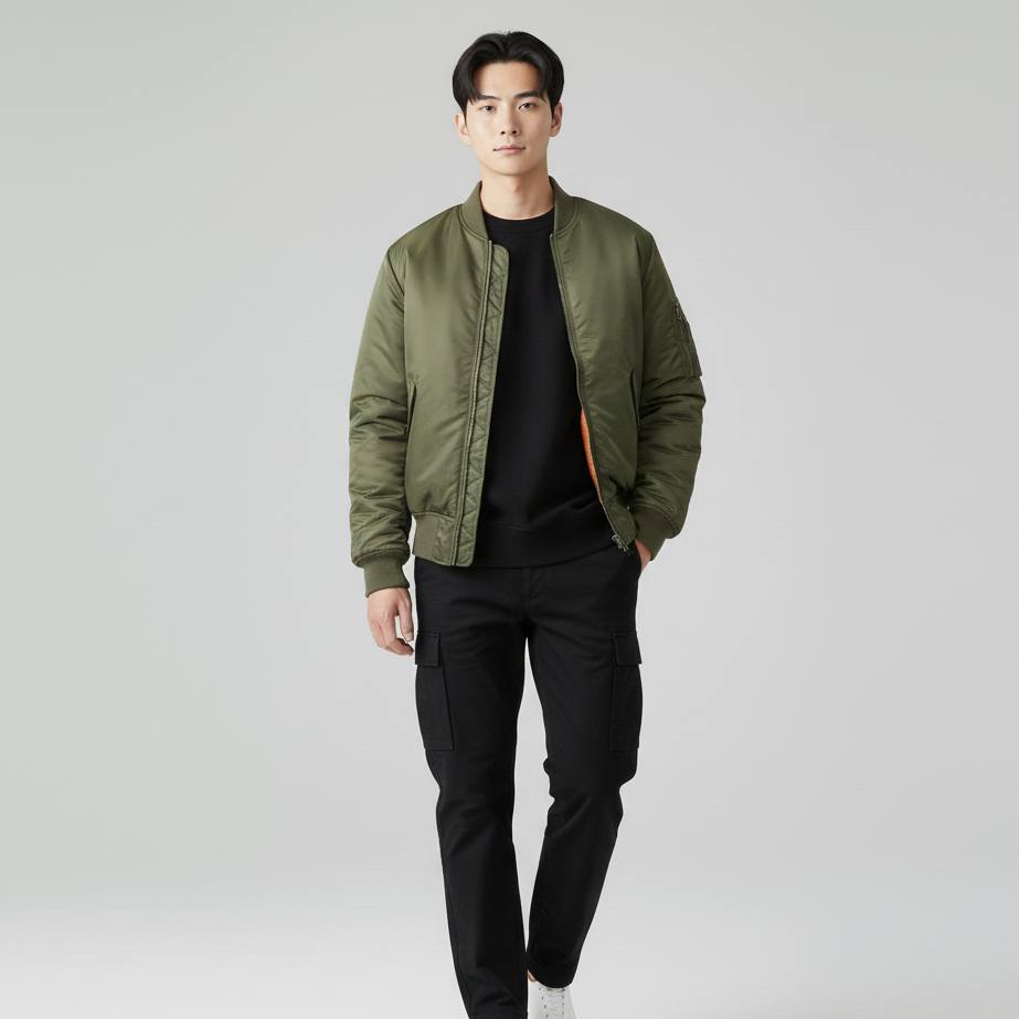 ポイント: カーキは主張が強いので、他をシンプルにまとめるとバランスが取れます。