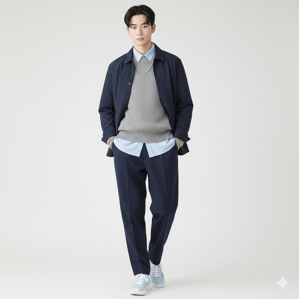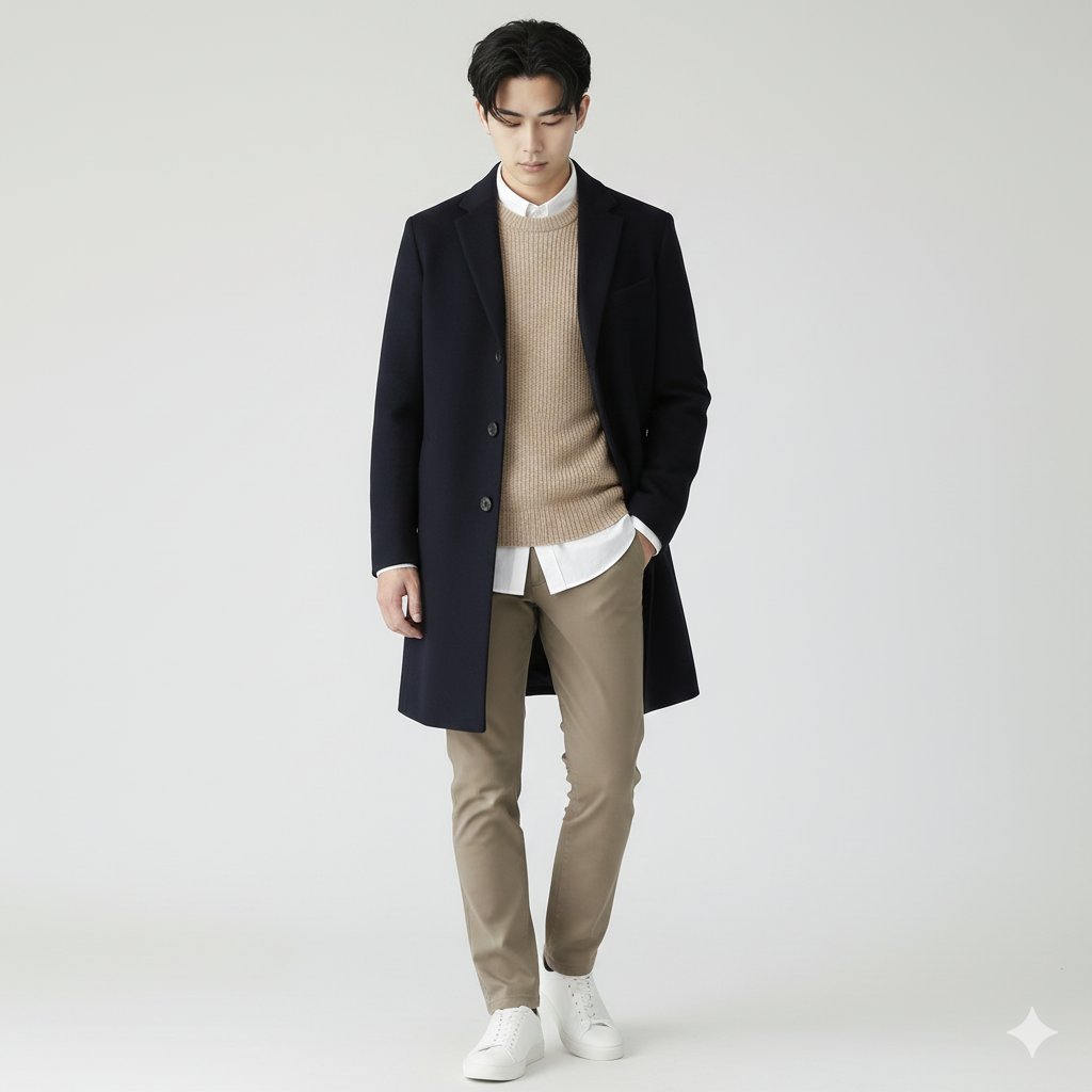 例: 黒コート × グレーニット × ネイビーパンツ × 白スニーカー