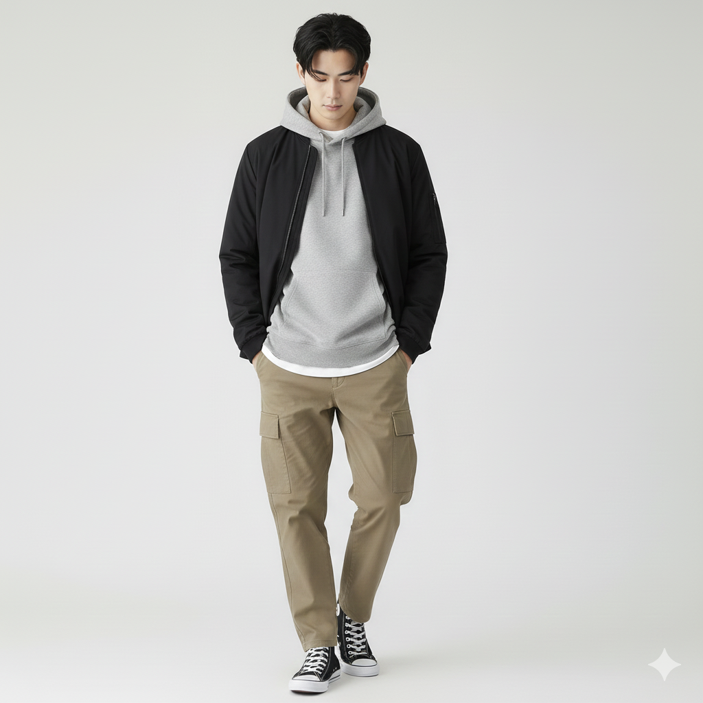 ポイント: 動きやすく、リラックス感のあるストリートカジュアル。