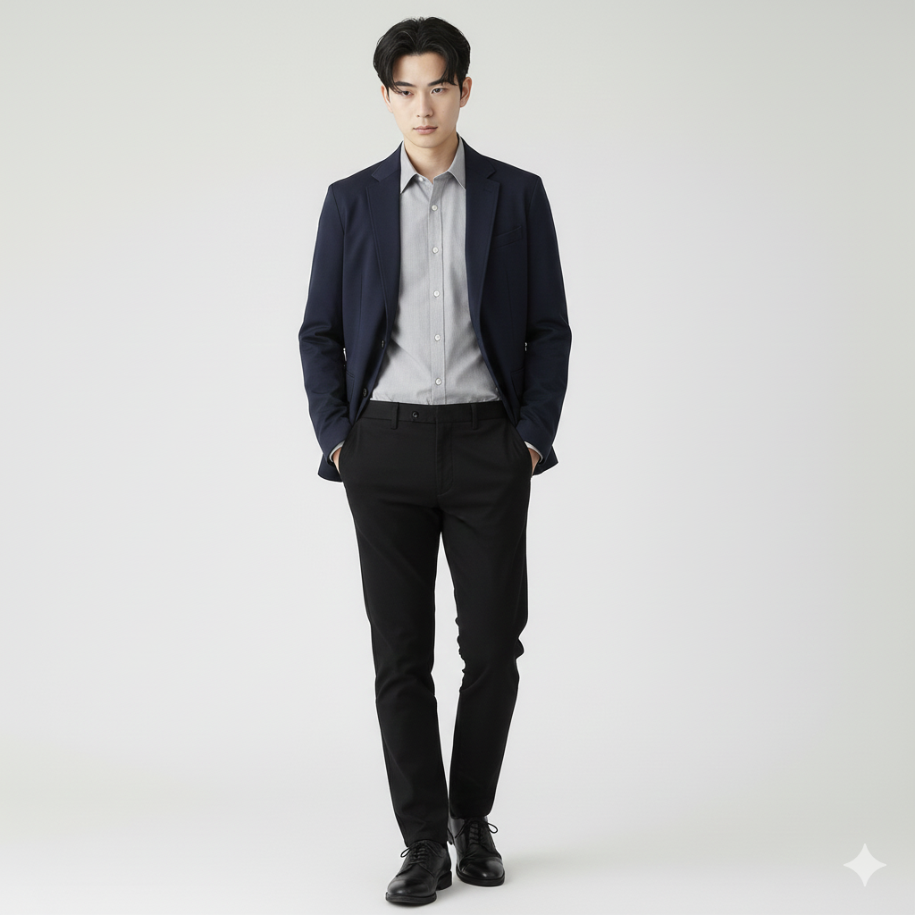 ポイント: ネイビーは白やベージュと組み合わせると、清潔感のある爽やかな印象になります。
