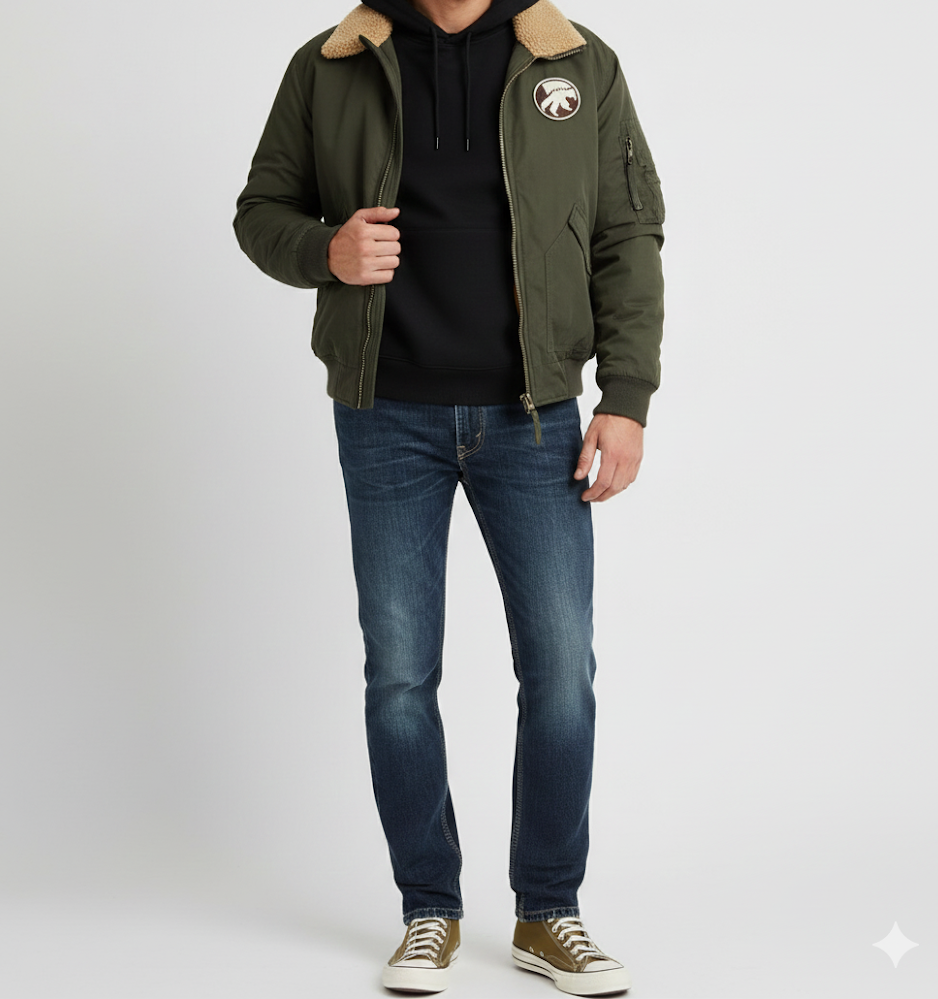 スリムなデニムにパーカーとMA-1を重ねた、冬のストリートスタイル。黒やカーキのMA-1がデニムと相性抜群です。パーカーのフードをMA-1から出すことで、レイヤード感が出てオシャレ度アップ。足元はナイキのエアフォース1やコンバースのハイカットでストリート感を強調。防寒もバッチリの実用的コーデです。