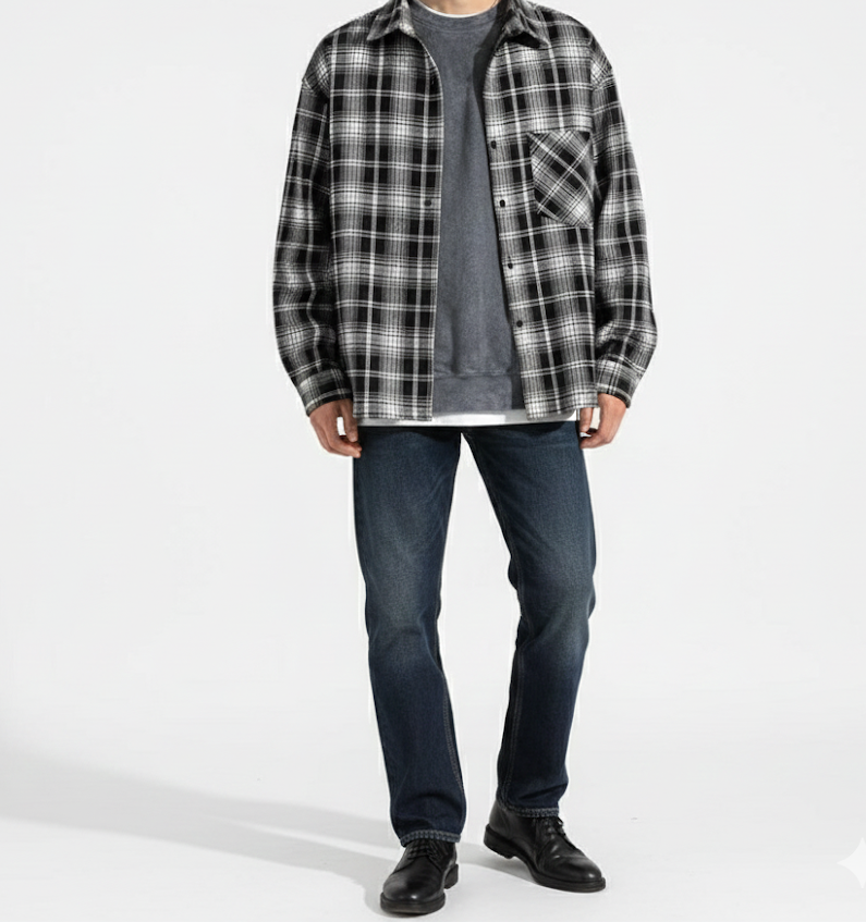 チェック柄のネルシャツをロンTの上に羽織った、秋らしいレイヤードスタイル。赤系やブラウン系のネルシャツがデニムと相性抜群。シャツのボタンを開けて、インナーのロンTを見せることでこなれ感が出ます。足元は白やベージュのスニーカーで軽やかに。デートや友達とのお出かけにも使える万能コーデです。