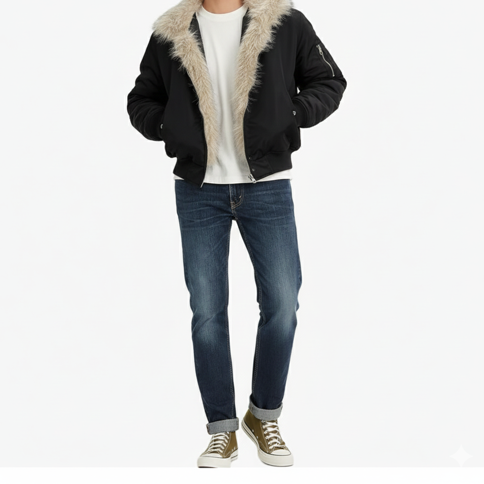 アイテム: Levis 511(3,500円) × 厚手パーカー(2,000円) × MA-1ジャケット(3,000円) × ハイカットスニーカー(手持ち)