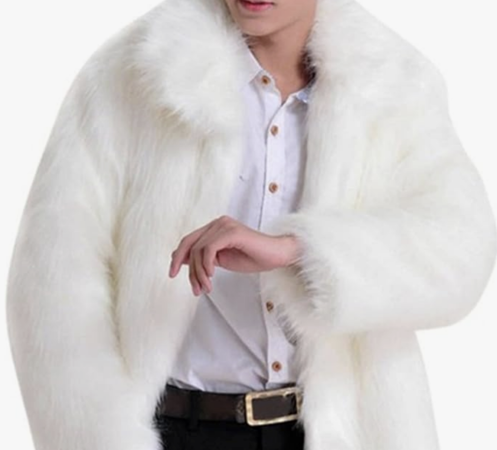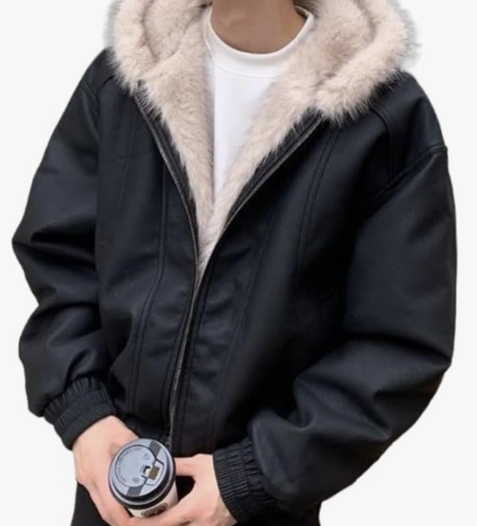 レザーボンバージャケット(ファーフード付き): ブラックのレザー素材のボンバージャケットに、ベージュまたはグレーのファーフードが付いたデザインです。高級感と防寒性を兼ね備えた冬の主役アイテムです。