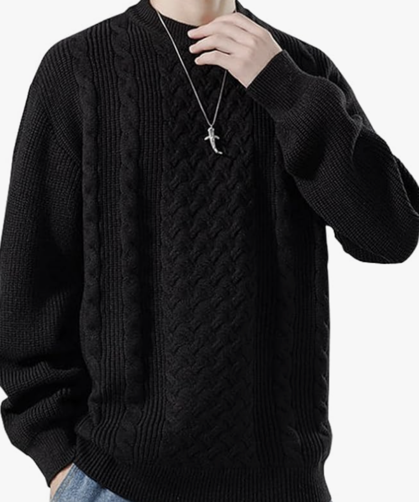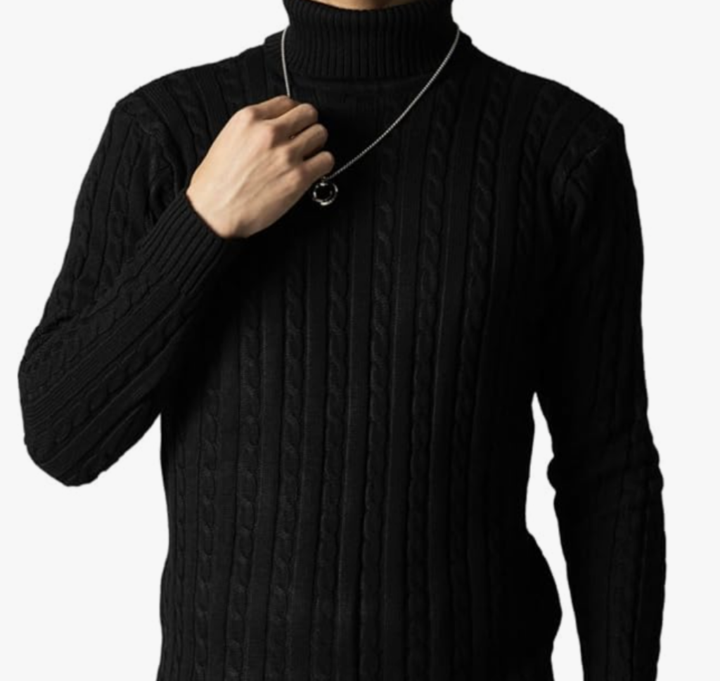ブラックタートルネックニット: リブ編みのタートルネックニットは、首元を暖かく保ちながらスマートな印象を与えます。適度なフィット感のあるものを選ぶことで、コートの下でもすっきりと着こなせます。