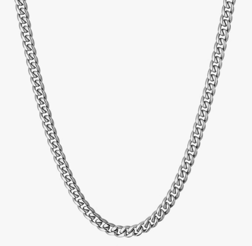 チェーンネックレス: シルバーのチャンキーなチェーンネックレスが、アクセントとして効いています。