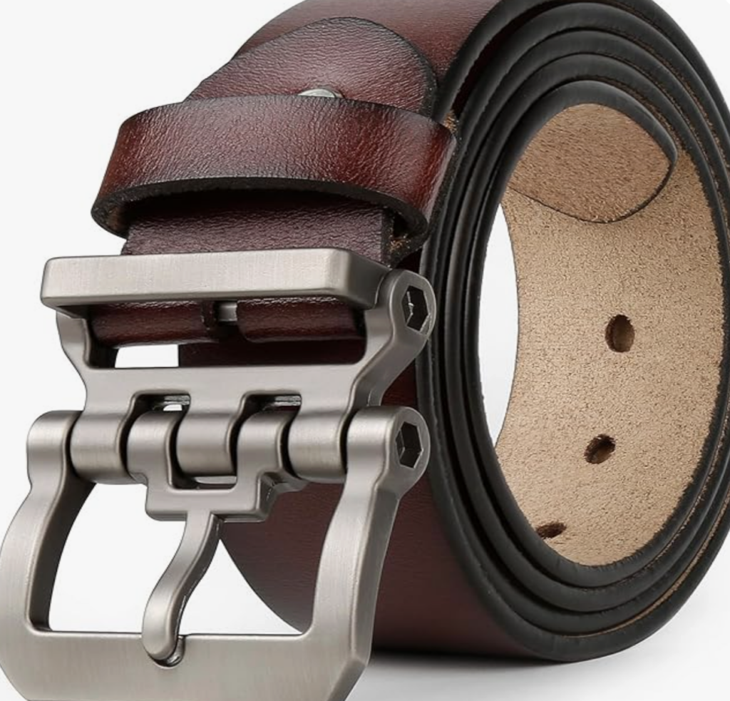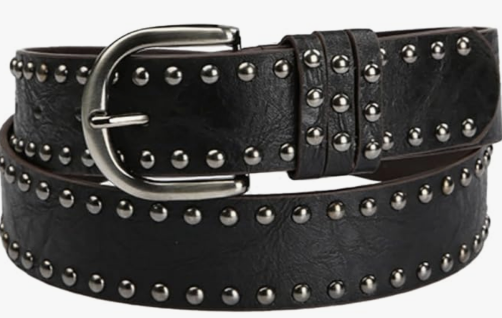 スタッズベルト: ブラックのレザーベルトに小さなスタッズが付いたデザインが、さりげないアクセントになっています。