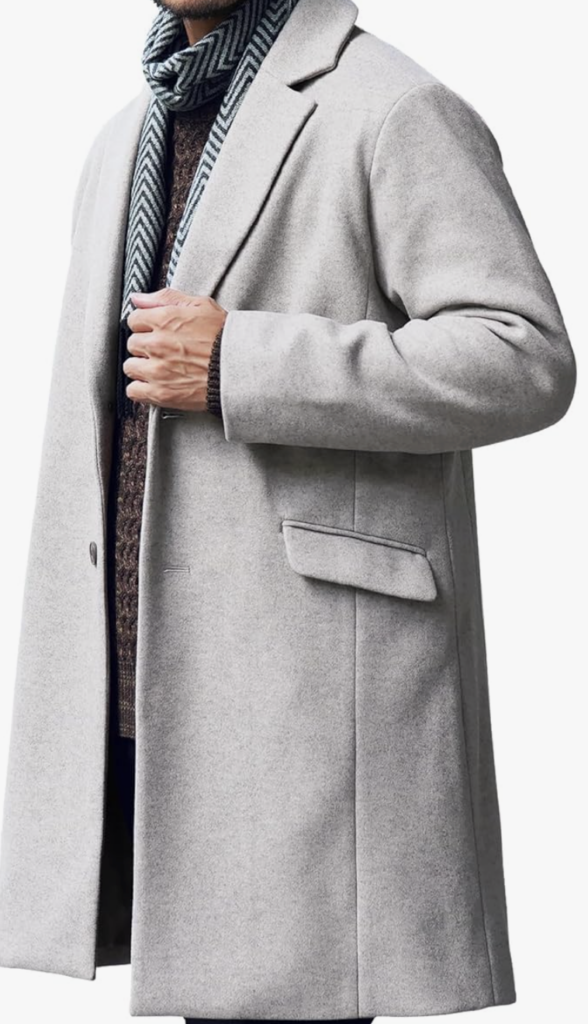 ステンカラーコート: グレーのステンカラーコートは、ビジネスからカジュアルまで幅広く対応できる万能アウターです。膝丈程度のミディアムレングスが、バランスの良いシルエットを生み出します。