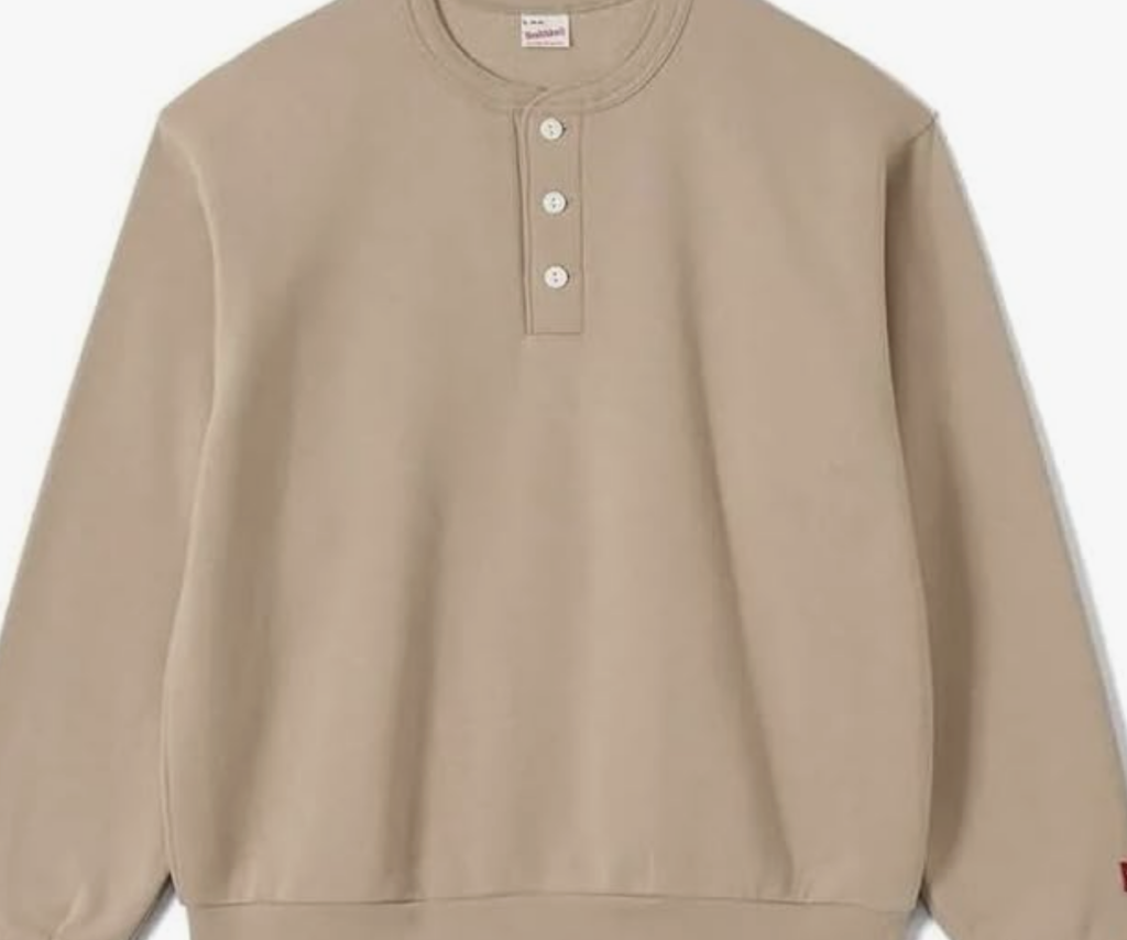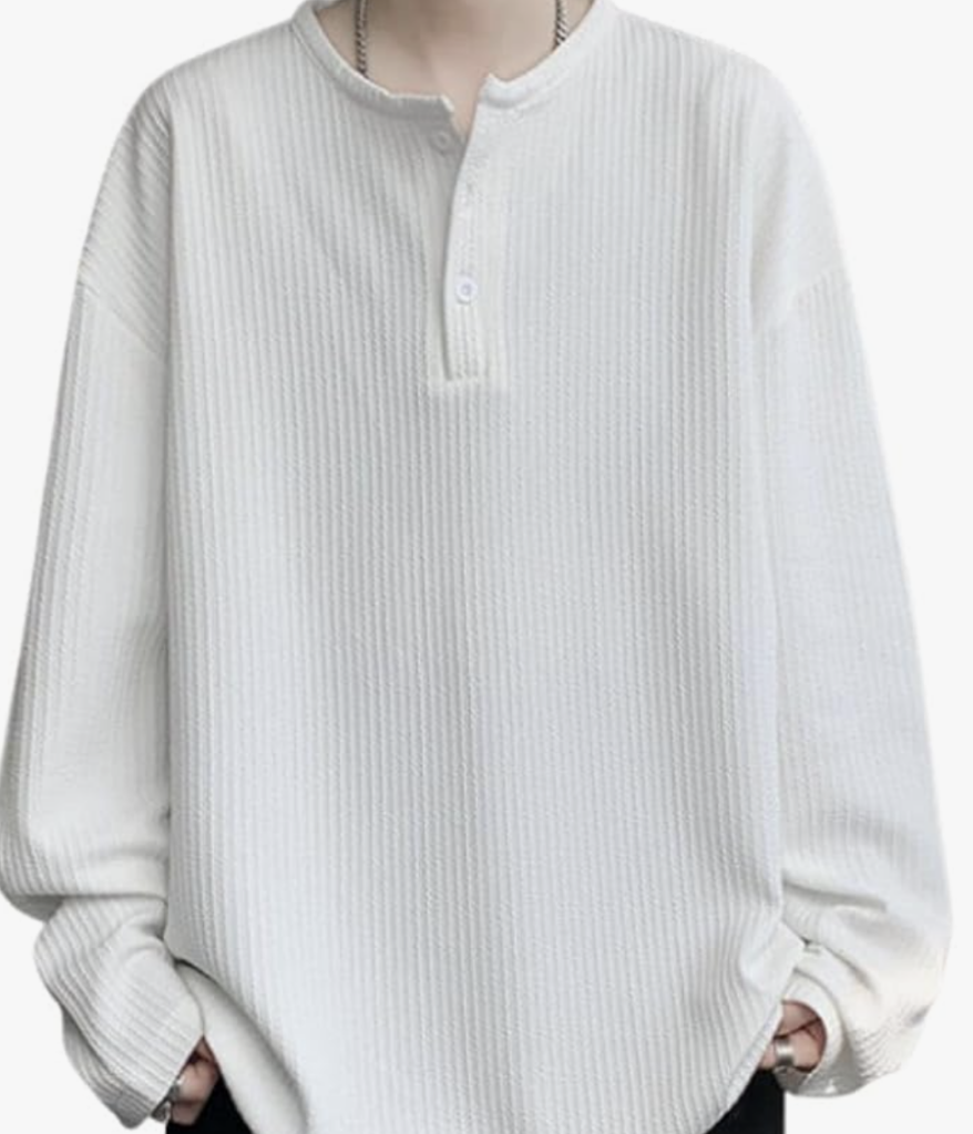 リブニット(ヘンリーネック): ベージュまたはキャメルカラーのリブニットは、縦のラインを強調し、スタイリッシュな印象を与えます。ヘンリーネックのボタンがアクセントになっています。