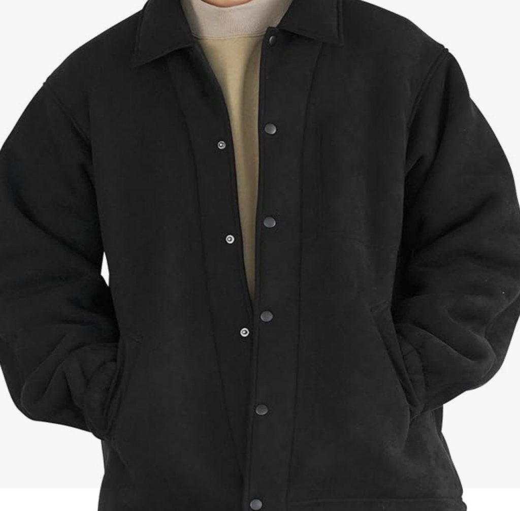 コーチジャケット: ブラックのコーチジャケットは、軽量でありながら防風性に優れた春秋冬の定番アウターです。襟付きのデザインがカジュアルすぎない印象を与えます。