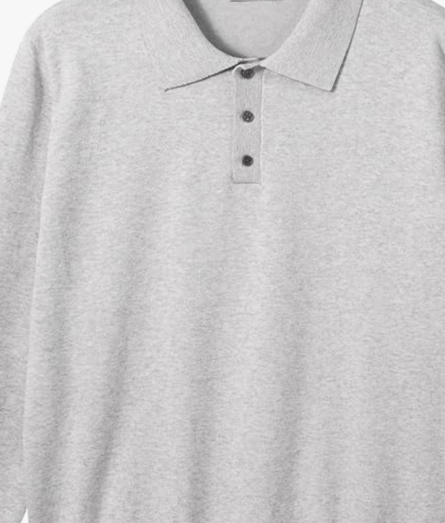 グレーポロシャツニット: グレーのポロシャツタイプのニットが、カジュアルとドレッシーの中間的な役割を果たします。襟のデザインがレイヤードに奥行きを与えます。