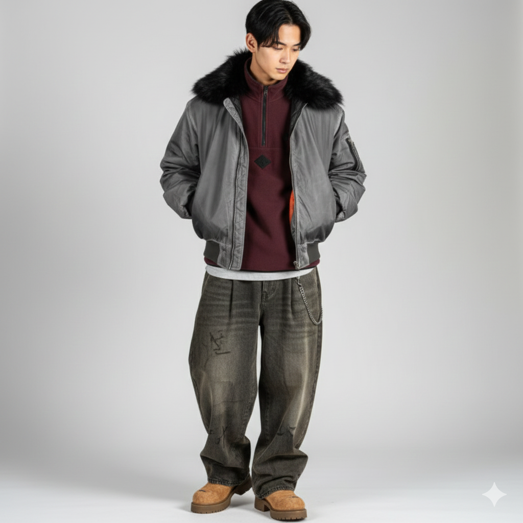 グレーのボンバージャケット(MA-1タイプ)にファーカラーを組み合わせた、ストリート感とアウトドア要素をミックスしたスタイルです。ボルドーのハーフジップをレイヤードし、色のアクセントを効かせています。ワイドなヴィンテージデニムとの組み合わせで、リラックスしたムードを演出しています。