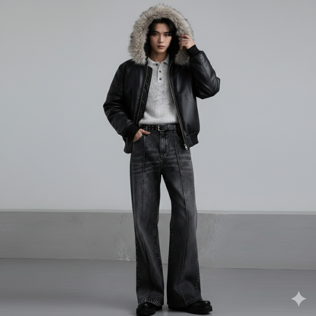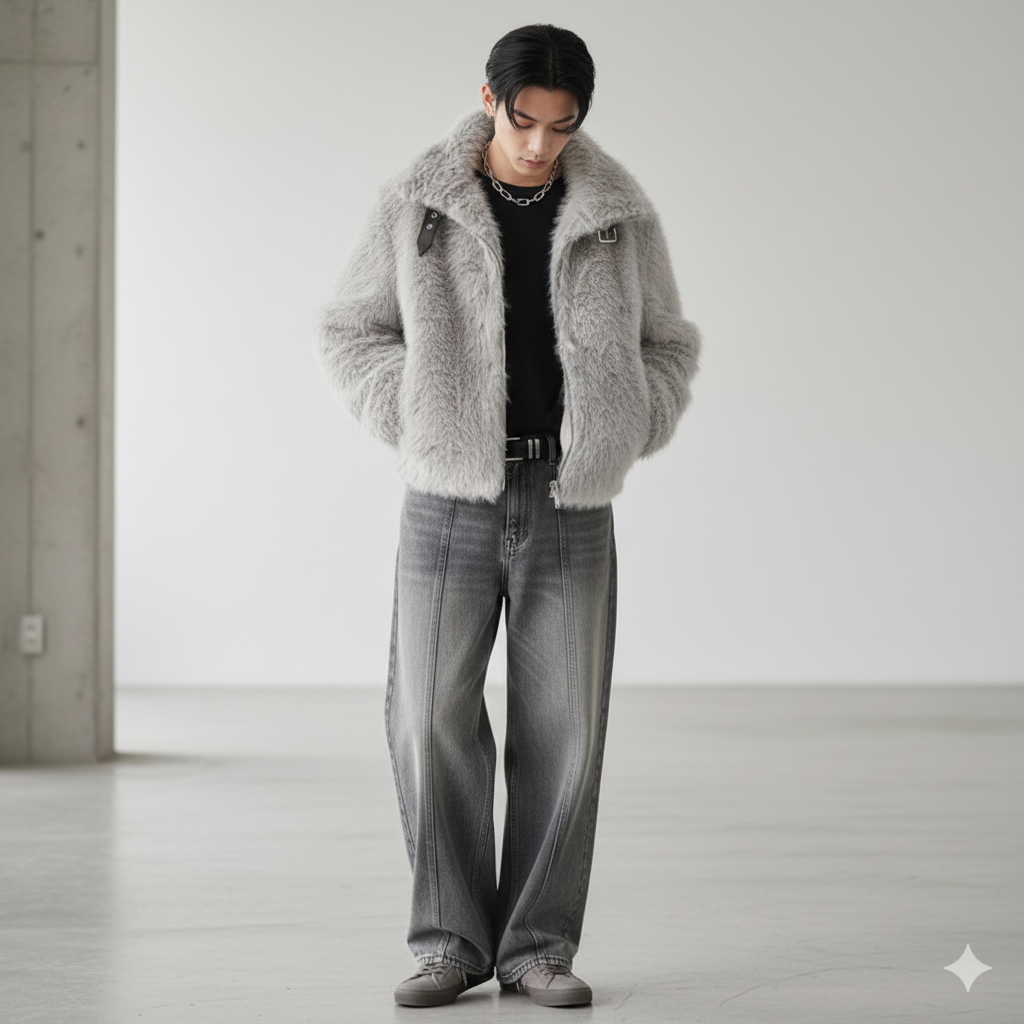 コーディネート1: ファージャケット × ワイドデニムのストリートスタイル