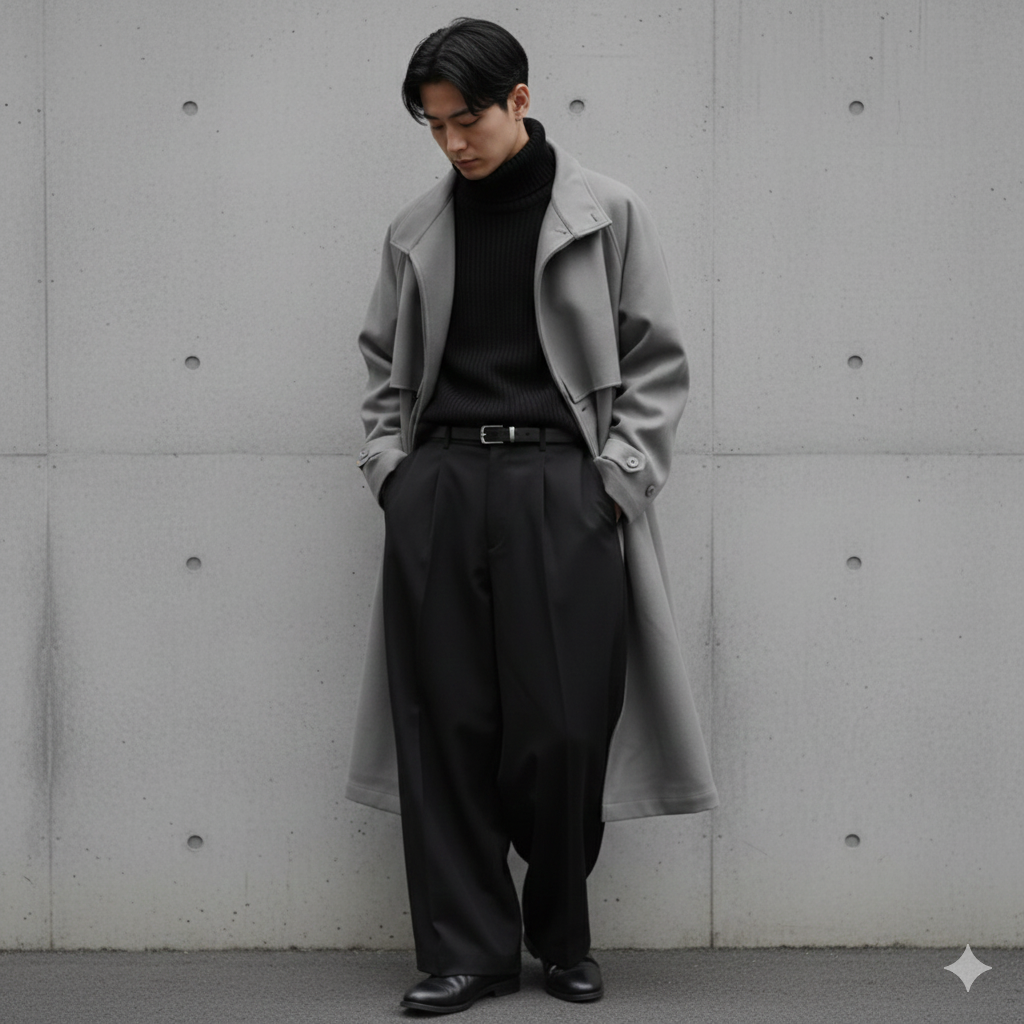 グレーのステンカラーコートとブラックのタートルネックを合わせた、クラシックで洗練されたモノトーンスタイルです。ワイドシルエットのブラックスラックスが、トレンド感と大人の余裕を演出しています。シンプルながらも計算されたシルエットが、知的で都会的な印象を作り出します。