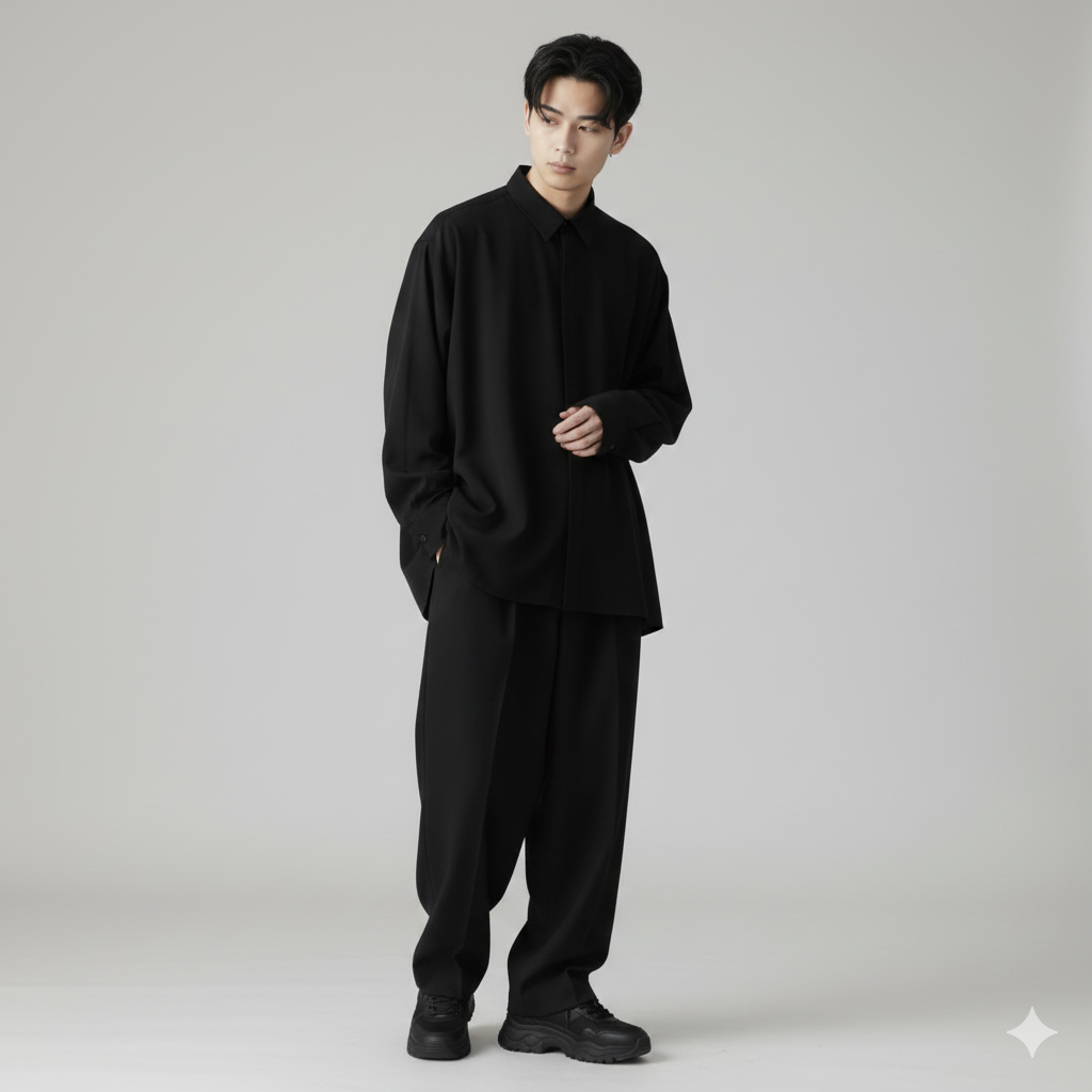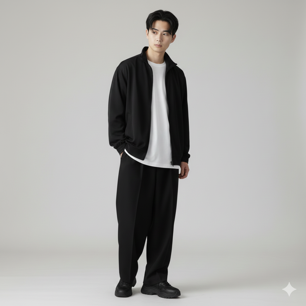 全身黒なのに重たく見えないのは、絶妙なシルエットバランスのおかげ。まさに「計算され尽くしたリラックス感」です。