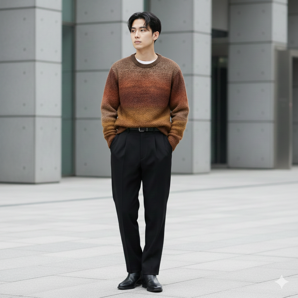 モヘアっぽい毛足のある質感と、秋らしいグラデーション配色。これ一枚でコーディネートの主役になれるタイプのニットです。