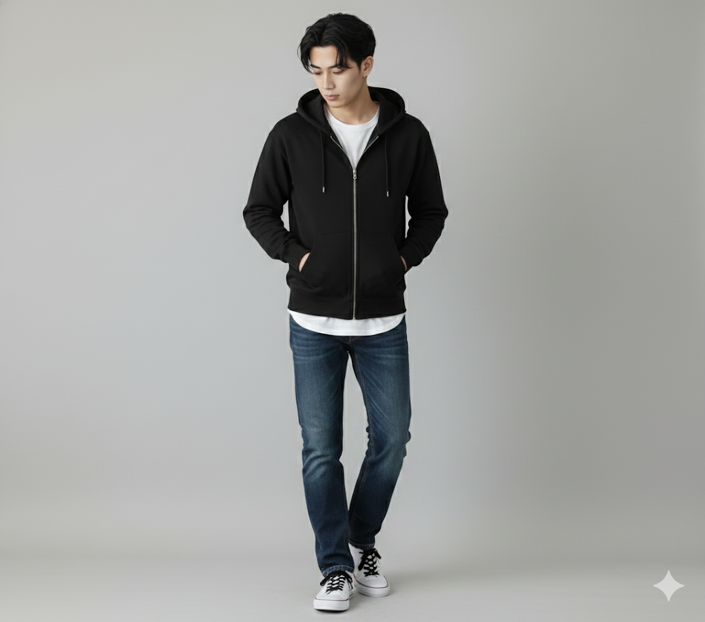 フードの立ち方も良くて、被ったときのシルエットがちゃんと様になりますね。アウターのインナーにもいけますし、単体でも主役になれる一枚です。正直、迷わず買いレベルだと思います。