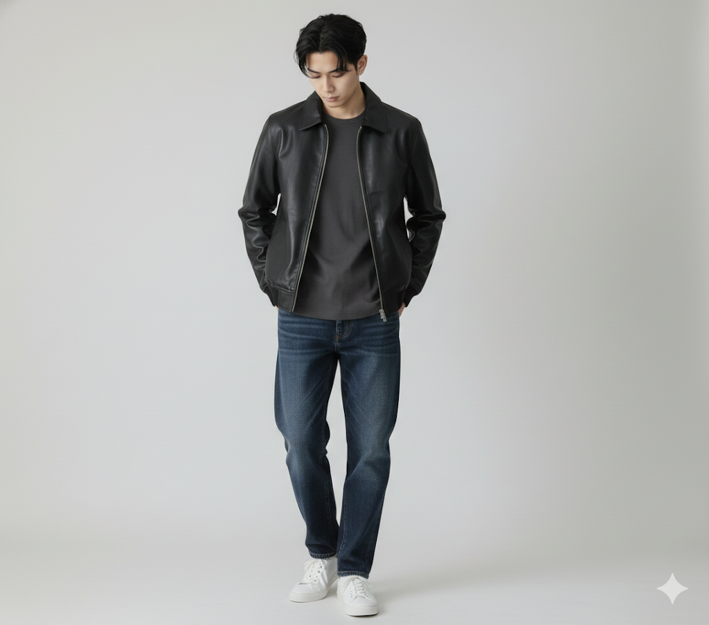 レザー特有のクリーンな光沢があって、カジュアルなスタイルをワンランク上げてくれる一着だと思います。これ着ているだけで「おしゃれしてきたな」感が出るので、勝負服候補ですね。