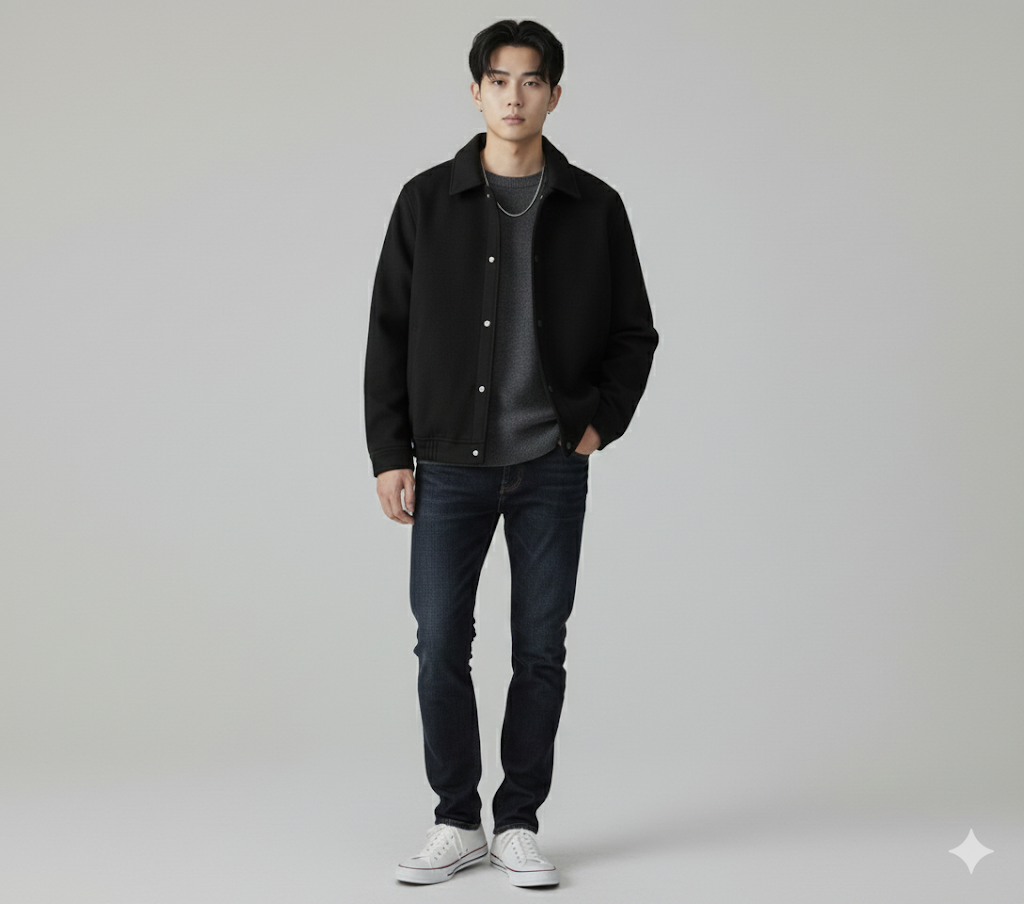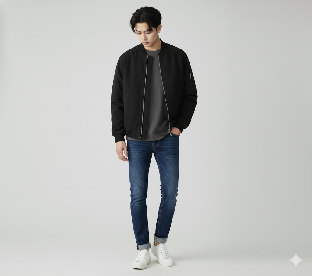 これはもう、万能アウターの代表格ですね。襟付きのスイングトップって、きれいめにもカジュアルにも振れるから、一枚持っておくと本当に便利なんです。