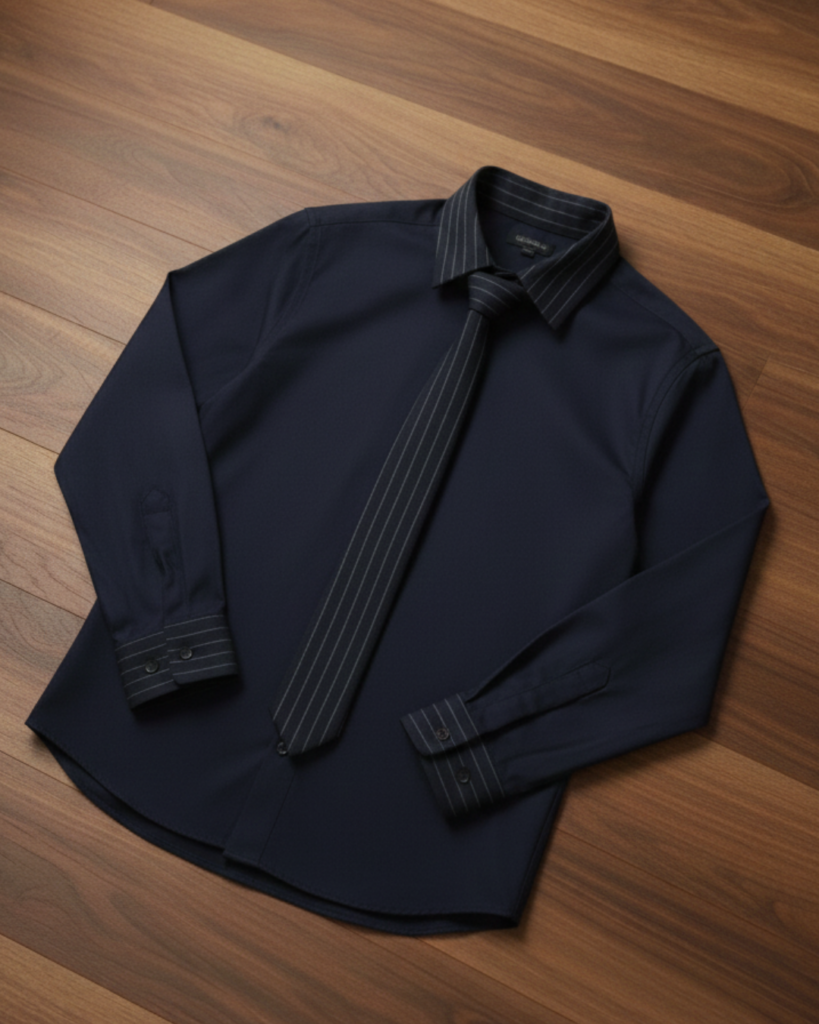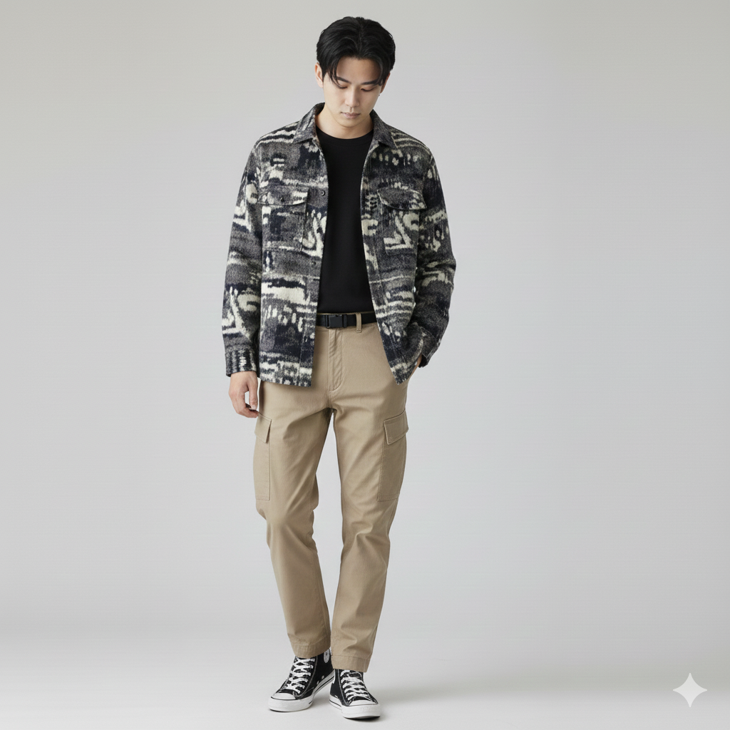 ポイント: デザイン性の高いシャツを主役にしたコーデ。黒のロングTシャツを下に着て、袖や裾からチラ見せすることで立体感が生まれます。カーゴパンツでストリート感を強めつつ、全体はモードにまとめるバランスが重要。